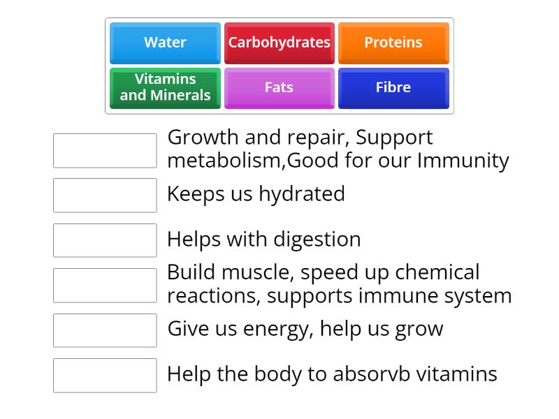 Proteins - Build muscle, speed up chemical reactions, supports immune system, Fats - Help the body to absorvb vitamins, Carbohydrates - Give us energy, help us grow, Water - Keeps us hydrated , Vitamins and Minerals - Growth and repair, Support metabolism,Good for our Immunity, Fibre - Helps with digestion ,
