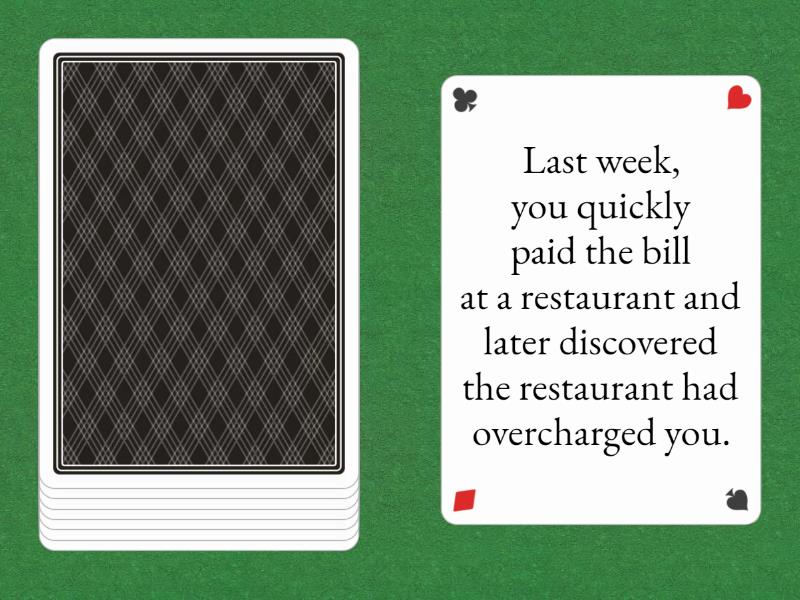 : Last week, you lost your passport at the airport and couldn't board the plane to go on holiday., Last week, you parked your car on the high street but didn't see the 'No parking' sign and received a parking fine., Last week, you injured your neck in a car accident because you weren't wearing a seatbelt., Last week, you took a taxi from the airport to the city centre. You found out later that the bus was a lot quicker and cheaper., Last week, you quickly paid the bill at a restaurant and later discovered the restaurant had overcharged you., Last week, you had a fight and got a black eye., Last week, you were invited to a party. At the party, you met your favourite actor., If you ________ your own name, what _______ yourself? (choose, call),