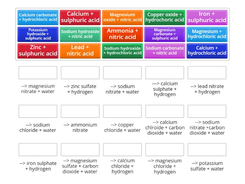 Zinc + sulphuric acid - --> zinc sulfate + hydrogen, Magnesium oxide + nitric acid - --> magnesium nitrate + water, Copper oxide + hydrochoric acid - --> copper chloride + water, Calcium + hydrochloric acid - --> calcium chloride + hydrogen, Sodium hydroxide + nitric acid - --> sodium nitrate + water, Ammonia + nitric acid - --> ammonium nitrate, Potassium hydroxide + sulphuric acid - --> potassium sulfate + water, Lead + nitric acid - --> lead nitrate + hydrogen, Magnesium + hydrochloric acid - --> magnesium chloride + hydrogen, Iron + sulphuric acid - --> iron sulphate + hydrogen, Sodium hydroxide + hydrochloric acid - --> sodium chloride + water, Calcium + sulphuric acid - ---> calcium sulphate + hydrogen, Calcium carbonate + hydrochloric acid - --> calcium chlroide + carbon dioxide + water, Magnesium carbonate + sulphuric acid - --> magnesium sulfate + carbon dioxide + water, Sodium carbonate + nitric acid - --> sodium nitrate +carbon dioxide + water,
