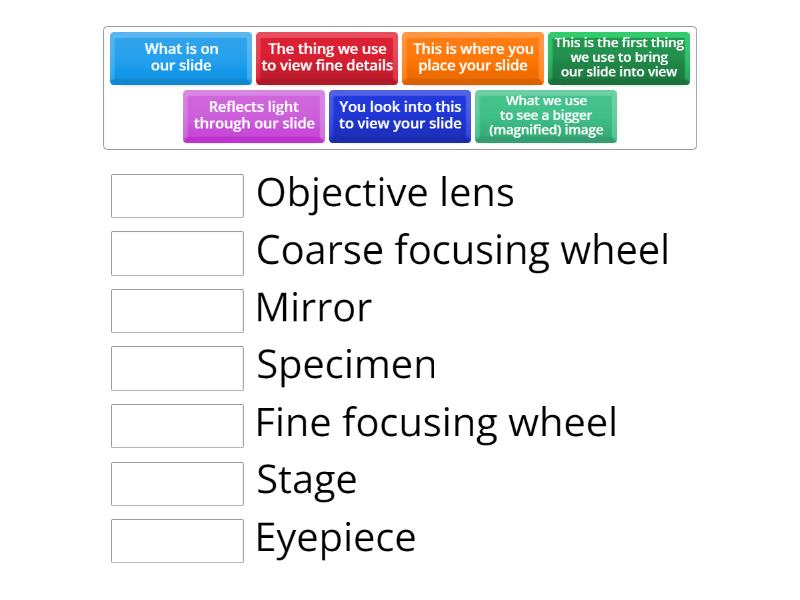 This is where you place your slide - Stage, You look into this to view your slide - Eyepiece, This is the first thing we use to bring our slide into view - Coarse focusing wheel, The thing we use to view fine details - Fine focusing wheel, What we use to see a bigger (magnified) image - Objective lens, Reflects light through our slide - Mirror, What is on our slide - Specimen,