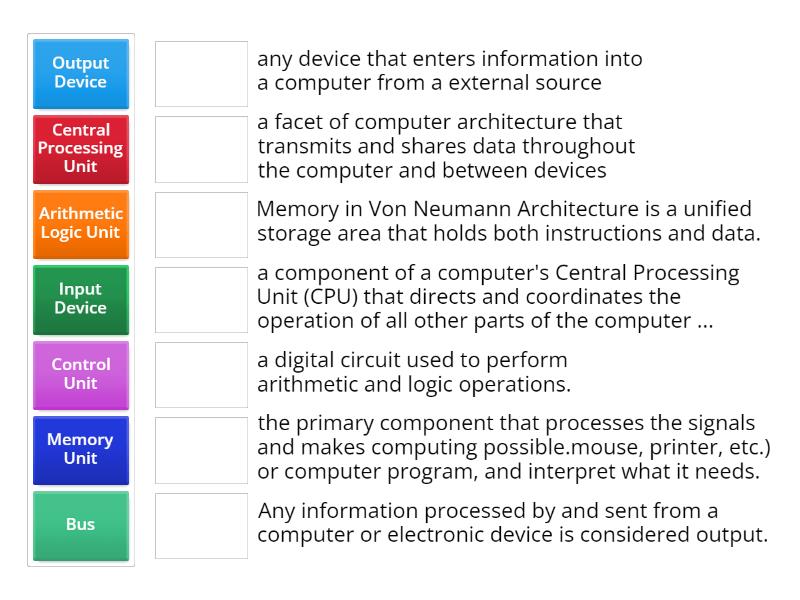 Central Processing Unit - the primary component that processes the signals and makes computing possible.mouse, printer, etc.) or computer program, and interpret what it needs. ​, Control Unit - a component of a computer's Central Processing Unit (CPU) that directs and coordinates the operation of all other parts of the computer ..., Arithmetic Logic Unit - a digital circuit used to perform arithmetic and logic operations., Memory Unit - Memory in Von Neumann Architecture is a unified storage area that holds both instructions and data., Input Device - any device that enters information into a computer from a external source, Output Device - Any information processed by and sent from a computer or electronic device is considered output., Bus - a facet of computer architecture that transmits and shares data throughout the computer and between devices,