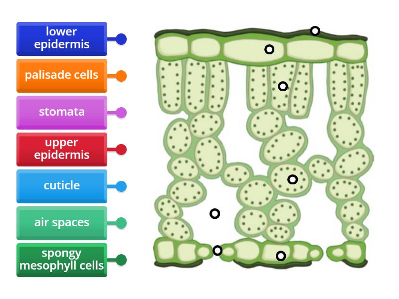 cuticle, upper epidermis, palisade cells, spongy mesophyll cells, stomata, lower epidermis, air spaces.