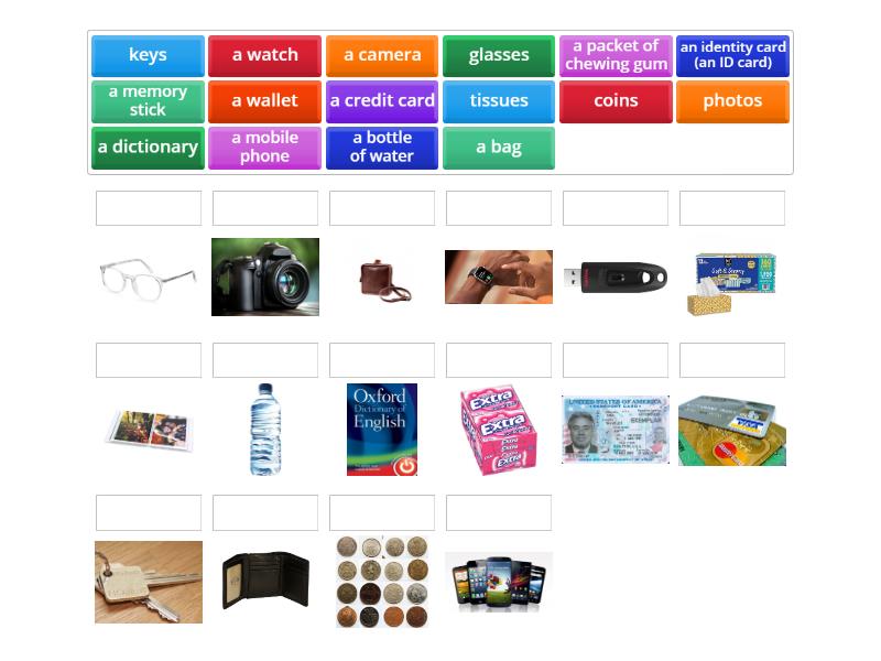 a bottle of water, an identity card (an ID card) , a mobile phone, a packet of chewing gum , a camera, a credit card, a dictionary , a memory stick, a wallet , keys, photos, coins, tissues, glasses, a bag, a watch,