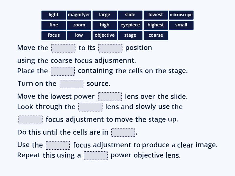 Move the ____ to its ____ position using the coarse focus adjusmennt. Place the ____ containing the cells on the stage. Turn on the ____ source. Move the lowest power ____ lens over the slide. Look through the ____ lens and slowly use the ____ focus adjustment to move the stage up. Do this until the cells are in ____. Use the ____ focus adjustment to produce a clear image. Repeat this using a ____ power objective lens.