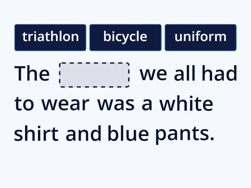 The ____ we all had to wear was a white shirt and blue pants. I loved to ride my ____ to my friend's house. I will cheer on my mom who will compete in a ____ this year.
