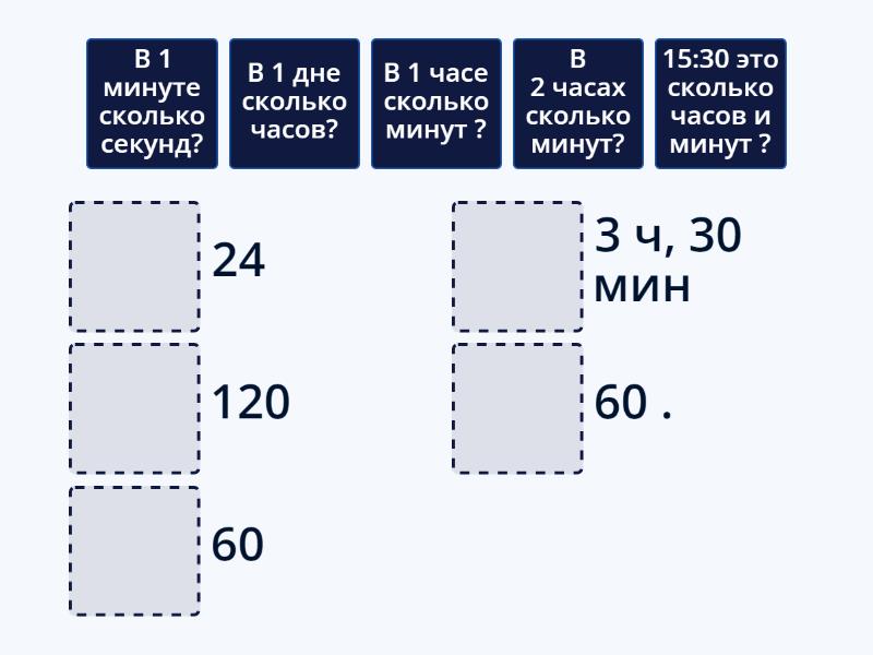 В 1 минуте сколько секунд? - 60, В 1 часе сколько минут ? - 60 ., В 1 дне сколько часов? - 24, В 2 часах сколько минут? - 120, 15:30 это сколько часов и минут ? - 3 ч, 30 мин,