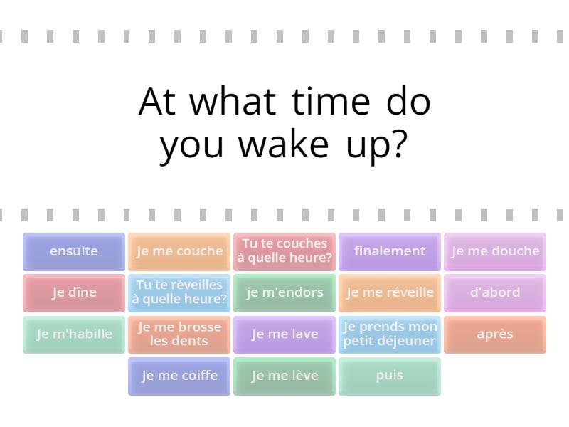 Tu te réveilles à quelle heure? - At what time do you wake up?, Tu te couches à quelle heure? - At what time do you go to bed?, Je me réveille - I wake up, Je me lève - I get up, Je me douche - I have a shower, Je me coiffe - I style my hair, Je m'habille - I get dressed, Je me brosse les dents - I brush my teeth, Je me lave - I wash myself, Je prends mon petit déjeuner - I eat breakfast, Je dîne - I eat dinner, Je me couche - I go to bed, je m'endors - I fall asleep, d'abord - first of all / firstly, ensuite - next, puis - then, après - after, finalement - lastly,