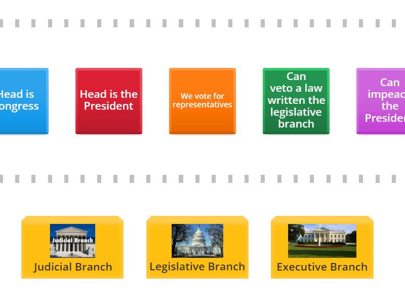 Judicial Branch: Made of the court system, Can declare a law unconstitutional, Has judges, Head is the Supreme Court, Legislative Branch: Writes laws, Head is Congress, We vote for representatives, Can impeach the President, Executive Branch: Enforces the laws, Head is the President, Appoints members of the Supreme Court, Can veto a law written the legislative branch,