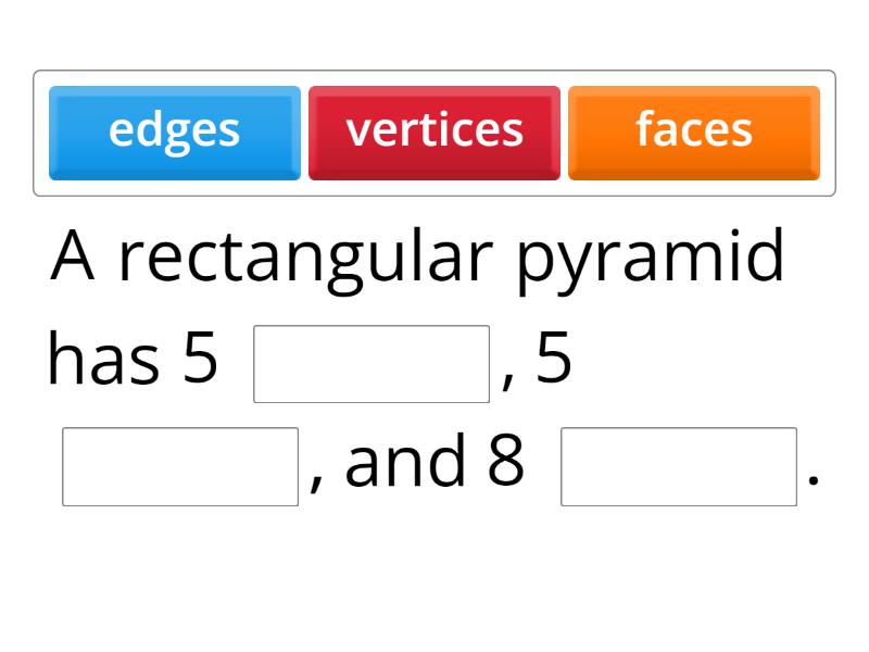 A rectangular pyramid has 5 ____, 5 ____, and 8 ____. One face is the ____ base and 4 are in the shape of a ____. All the triangular faces are ____ to the ____ face One of the vertexes meet at the ____ which is right above the ____ of the pyramid.