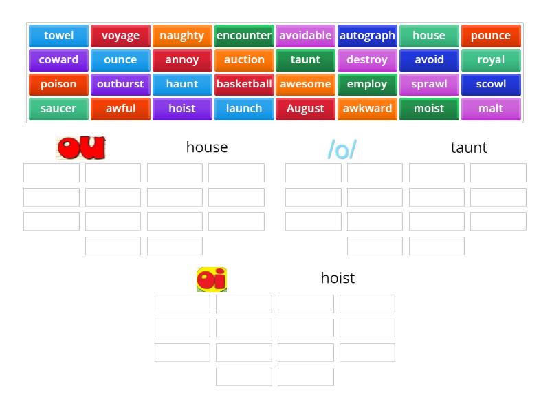 house: house, outburst, towel, ounce, scowl, pounce, coward, encounter, taunt: taunt, awful, malt, sprawl, launch, basketball, haunt, naughty, saucer, August, auction, awkward, autograph, awesome, hoist: hoist, annoy, voyage, avoid, moist, destroy, poison, royal, avoidable, employ,