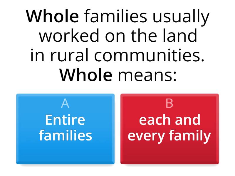 1) Whole families usually worked on the land in rural communities. Whole means: a) Entire families b) each and every family 2) All families usually worked on the land in rural communities. All means: a) each and every family b) entire families 3) There is 🤔 single person in the room! a) not a b) not any 4) I've got 🤔 time to waste in here a) not a b) no  5) She says she has 🤔 friends in this class a) no b) none of 6) She always has interesting ideas, but today 🤔 were good enough. a) none b) none of 7) 🤔 your friends confirmed whether or not they're coming to the party. a) none b) none of 8) We couldn't be reallocated to another flight because 🤔 of them were completely full. a) none of b) both of 9) I have a few ideas to share. A few means: a) I have some ideas b) I don't have many ideas c) I have no idea 10) I have few ideas. Few means: a) I have some ideas b) I don't have many ideas c) I have no idea