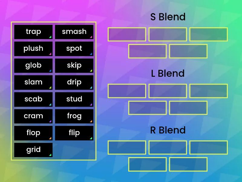 S Blend: smash, spot, stud, scab, skip, L Blend: glob, plush, slam, flip, flop, R Blend: frog, grid, cram, drip, trap,