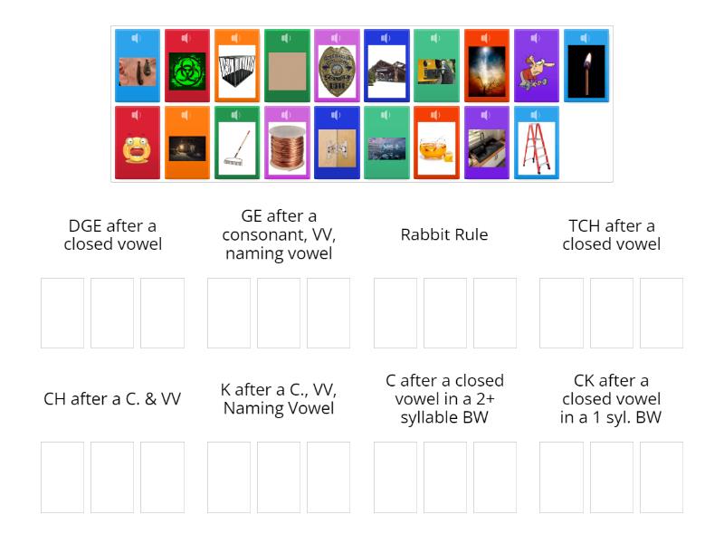 DGE after a closed vowel: , , GE after a consonant, VV, naming vowel: , , , Rabbit Rule: , , TCH after a closed vowel: , , CH after a C. & VV: , , K after a C., VV, Naming Vowel: , , , C after a closed vowel in a 2+ syllable BW: , , , CK after a closed vowel in a 1 syl. BW: , ,