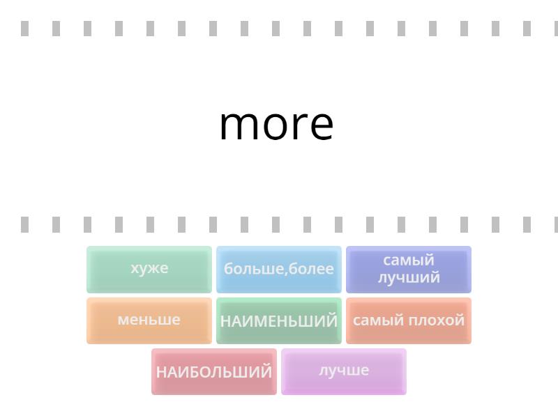 больше,более - more, НАИБОЛЬШИЙ - the most, меньше - less, НАИМЕНЬШИЙ - the least, лучше - better, самый лучший - the best, хуже - worse, самый плохой - the worst,