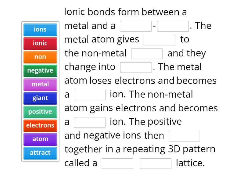 Ionic bonds form between a metal and a ____-____. The metal atom gives ____ to the non-metal ____ and they change into ____. The metal atom loses electrons and becomes a ____ ion. The non-metal atom gains electrons and becomes a ____ ion. The positive and negative ions then ____ together in a repeating 3D pattern called a ____ ____ lattice. The positive and negative ____ in a ____ ionic structure are held together by very ____ forces called ____ forces (or ____ bonds). These strong bonds exist throughout the whole giant structure and need a lot of ____ to break. The bonds need to be broken for the ionic substance to ____, so ionic substances have very ____ melting points. Ionic substances are always ____ at room temperature. Things can only ____ electricity if charged particles such as ____ or electrons can move through them. An ionic solid ____ conduct electricity because the ions can only ____ but cannot move ____ and carry the ____. When an ionic substance is melted or ____ the ions are ____ to move around and carry the charge so it ____ conduct electricity. Giant ionic structures always have ____ ions next to negative ions which strongly ____ together. If the structure is hit hard, a ____ of ions can move along one place so that the positive ____ are next to other positive ions and the ____ ions are next to other negative ions. If this happens the ions will ____ apart and the structure will ____. This is why all ionic substances are ____.