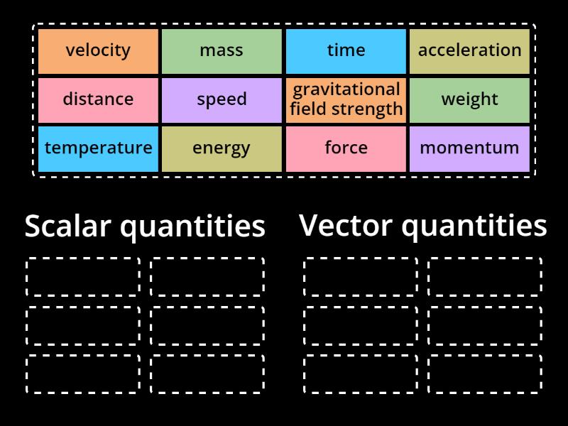 Scalar quantities: distance, time, speed, mass, energy, temperature, Vector quantities: velocity, force , weight, acceleration, momentum, gravitational field strength,
