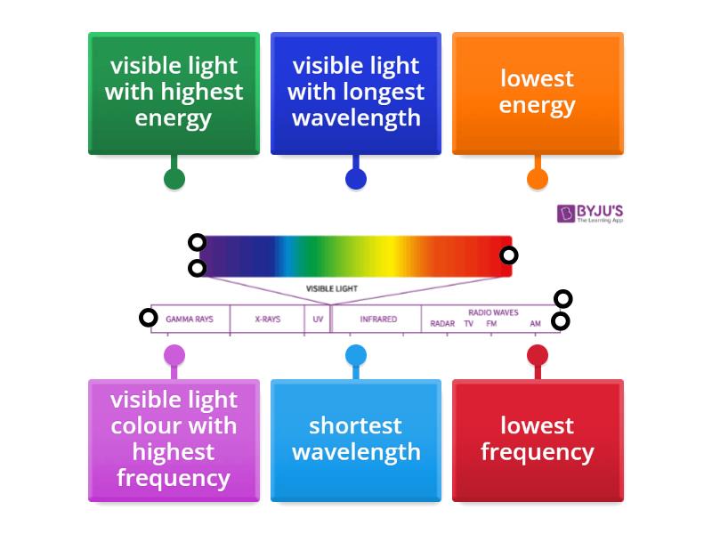 shortest wavelength, lowest frequency, lowest energy, visible light with highest energy, visible light colour with highest frequency, visible light with longest wavelength.