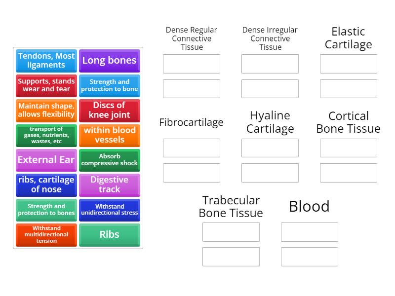 Dense Regular Connective Tissue: Withstand unidirectional stress , Tendons, Most ligaments , Dense Irregular Connective Tissue: Withstand multidirectional tension , Digestive track, Elastic Cartilage : Maintain shape, allows flexibility, External Ear, Fibrocartilage : Absorb compressive shock, Discs of knee joint, Hyaline Cartilage: Supports, stands wear and tear, ribs, cartilage of nose, Cortical Bone Tissue: Strength and protection to bones, Long bones, Trabecular Bone Tissue: Strength and protection to bone, Ribs, Blood: transport of gases, nutrients, wastes, etc, within blood vessels ,