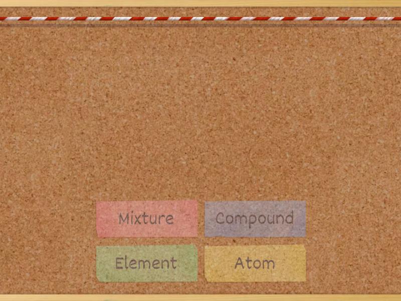 Element - A substance made up of only one type of atom., Mixture - When some elements or compounds are mixed together., Compound - A substance made when two or more elements are chemically bonded together., Atom - The smallest part of an element.,