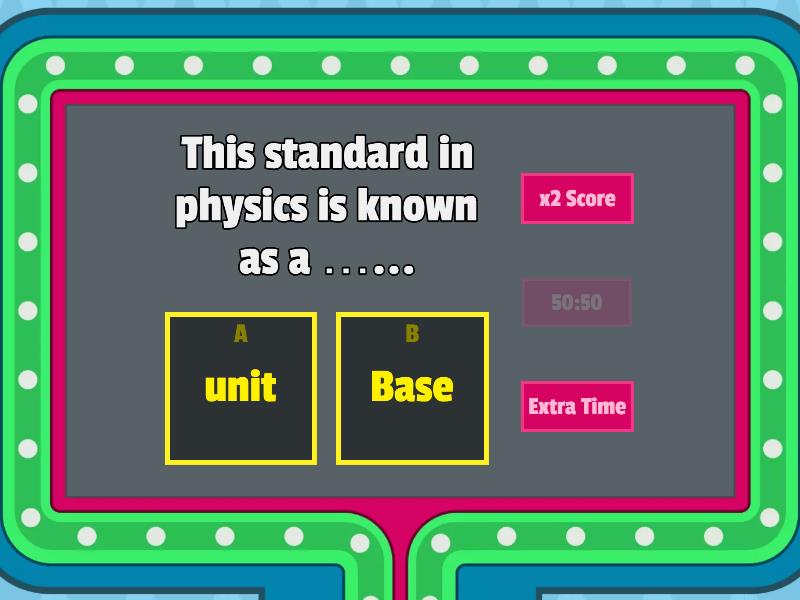 1) This standard in physics is known as a …... a) unit b) Base 2) Basic Quantity like a) Length b) Force 3) Derived quantity is   a) velocity b) Temperature 4) all quantities can be measured called a) chemical quantity b) physical quantity 5) If a quantity posses these 2 properties then it is a physical quantity a) numerical magnitude and unit b) Force and temperature 6) base unit is like a) mass, length, time and temperature b) force, area, velocity and volume