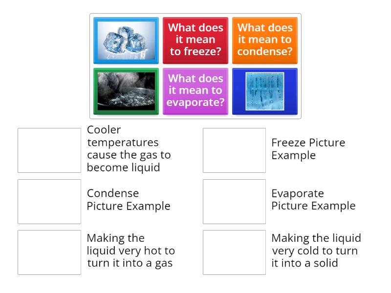 Freeze Picture Example, Evaporate Picture Example, Condense Picture Example, What does it mean to freeze? - Making the liquid very cold to turn it into a solid, What does it mean to evaporate? - Making the liquid very hot to turn it into a gas, What does it mean to condense? - Cooler temperatures cause the gas to become liquid,