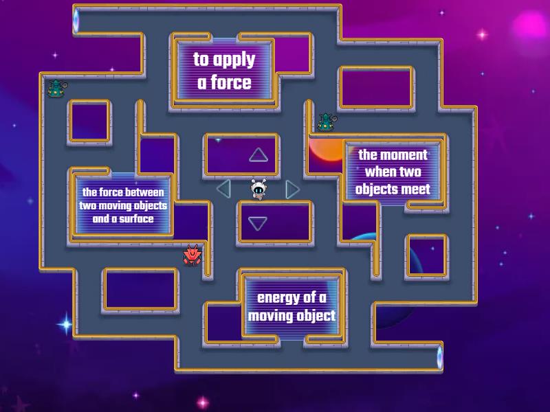 1) cause a) an event or process that leads to change b) the end result c) the moment when two objects meet d) push or pull of an object that can change motion 2) collision a) the energy of a moving object b) the moment when two objects meet c) the same in size, quantity, or degree d) anything that has mass and takes up space 3) speed a) the force between two moving objects and a surface b) the moment when two objects meet c) how fast an object is moving d) the result or change that happens 4) equal a) speed in a particular direction b) the moment two objects meet c) to apply a force d) the same in size, quantity, or degree 5) force a) the push or pull of an object that can cause change b) the force between two moving objects and a surface c) energy of a moving object d) how fast an object is moving 6) mass a) the force between two moving objects and a surface b) the amount of matter in an object c) the push or pull of an object that can cause change d) the moment when two objects meet 7) effect a) speed in a particular direction b) an event or process that leads to change c) the result or change that happens d) the moment when two objects meet 8) exert a) anything that has mass and takes up space b) speed in a particular direction c) energy of a moving object d) to apply a force 9) friction a) the force between two moving objects and a surface b) to apply a force c) energy of a moving object d) the moment when two objects meet 10) matter a) to apply a force b) anything that has mass and takes up space c) the result or change that happens d) speed in a particular direction 11) Kinetic Energy a) an event or process that leads to change b) anything that has mass and takes up space c) energy of a moving object d) to apply a force 12) velocity a) the moment when two objects meet b) speed in a particular direction c) the force between two moving objects and a surface d) the push or pull of an object that can cause change
