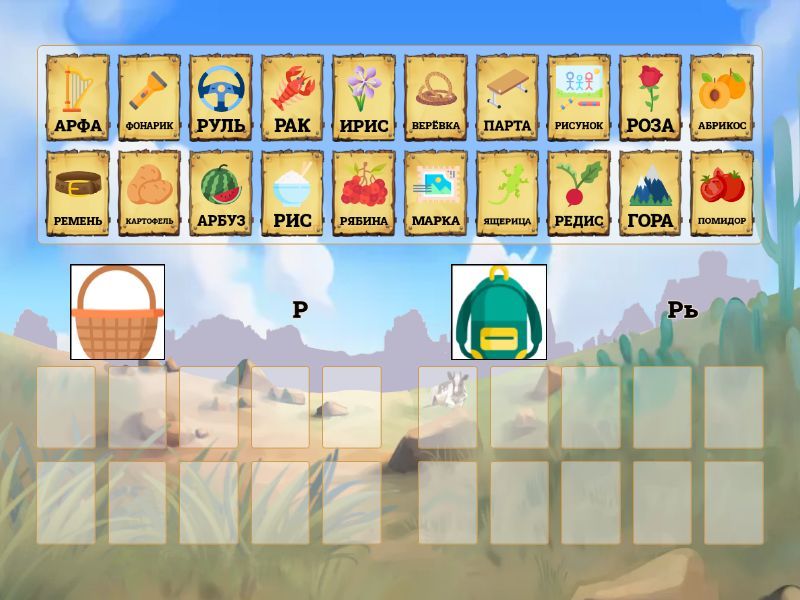 Р: ПОМИДОР, РОЗА, РАК, ГОРА, РУЛЬ, АРФА, МАРКА, КАРТОФЕЛЬ, ПАРТА, АРБУЗ, Рь: РЕДИС, РЕМЕНЬ, РЯБИНА, РИСУНОК, РИС, ИРИС, АБРИКОС, ВЕРЁВКА, ФОНАРИК, ЯЩЕРИЦА,