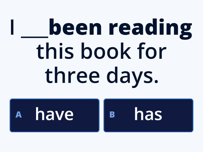 1) I ___been reading this book for three days. a) have b) has 2) She ___ been cleaning the flat for more than an hour. a) have b) has 3) You ___ been waiting for a bus for 30 minutes. a) have b) has 4) The teacher ___ been explaining a grammar rule since the beginning of the lesson. a) have b) has 5) The tourists ___ been doing the sightseeing since 9 a.m. a) have b) has 6) This cat ___ been sitting in the tree for 3 hours. a) have b) has 7) My parents ___ been travelling for a week. a) have b) has 8) Jane ___ been studying English for five years. a) have b) has 9) We ___ been working in the garden for more than an hour. a) have b) has 10) Kevin ___ been fishing since early morning a) have b) has