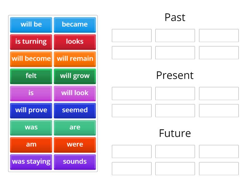 Past: was, were, seemed, became, felt, was staying, Present: is, are, am, looks, sounds, is turning, Future: will be, will become, will remain, will grow, will look, will prove,