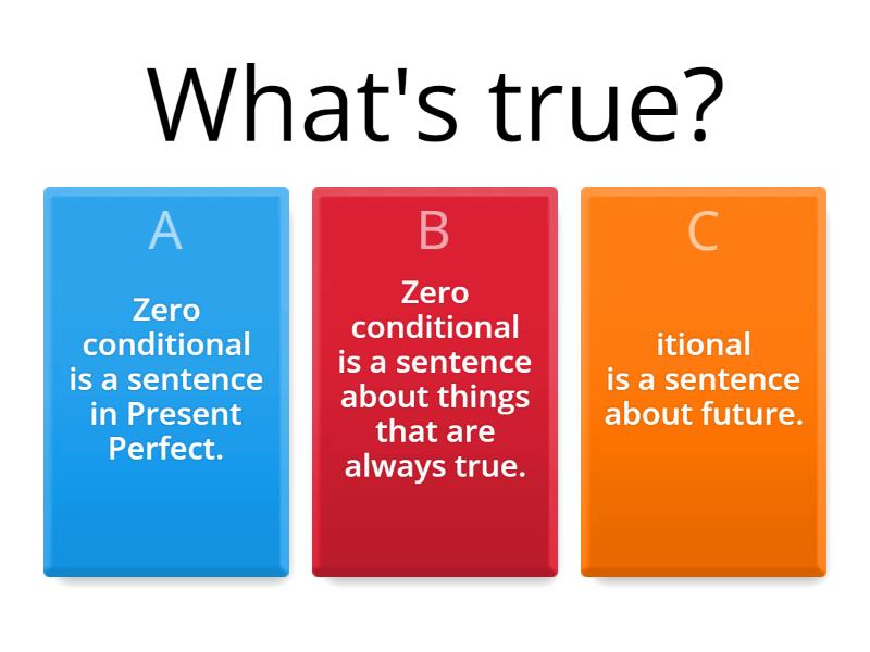 1) What's true? a) Zero conditional is a sentence in Present Perfect. b) Zero conditional is a sentence about things that are always true. c) itional is a sentence about future. 2) Choose 2 zero conditional sentences. a) If the weather is good, we will ride our bikes. b) If I cook, my kitchen always becomes messy. c) When he finishes work, we'll go to the movies. d) My kitchen always becomes messy when I cook. 3) If you heat water to 100°C, it ___________. a) will boil b) boils c) boiling 4) If it _________ here for many days here, bus drivers stop working. a) snow b) snows c) snowing 5) Which is true? a) First Conditional sentences are about things that are always true.rue. b) First Conditional sentences are about future possible situations. 6) Which is true? a) First Conditional sentences have 2 parts: both in Present Simple. b) First Conditional sentences have 2 parts: If-part in Present Simple, Result part in Future Simple. 7) If you clean the kitchen, a) Present Simple b) Future Simple 8) I will iron your clothes. a) Present Simple b) Future Simple 9) If he finishes early today, a) Present Simple b) Future Simple 10) we will go swimming. a) Present Simple b) Future Simple