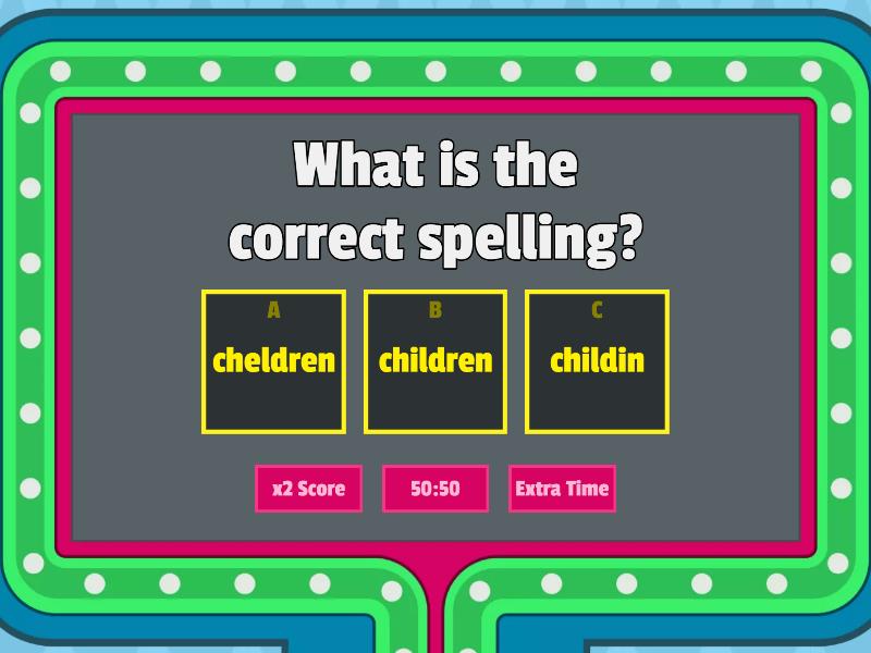 1) What is the correct spelling? a) cheldren b) children c) childin 2) What is the correct spelling? a) aneemal b) anemul c) animal 3) What is the correct spelling? a) salad b) saled c) salid 4) What is the correct spelling? a) camil b) camel c) camele 5) What is the correct spelling? a) lemin b) lemon c) lemun 6) What is the correct spelling? a) botom b) bottom c) bottum 7) What is the correct spelling? a) campes b) campus c) campis 8) What is the correct spelling? a) silent b) selent c) silunt 9) What is the correct spelling? a) albem b) albuum c) album 10) What is the correct spelling? a) festival b) festivul c) fistival