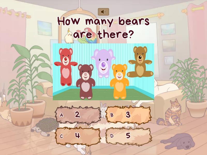 1) How many bears are there? a) 2 b) 3 c) 4 d) 5 2) How many cats are there? a) 1 b) 4 c) 3 d) 2 3) How many dogs are there? a) 5 b) 2 c) 3 d) 4 4) How many bunnies are there? a) 2 b) 1 c) 4 d) 3 5) How many tigers are there? a) 1 b) 2 c) 3 d) 4