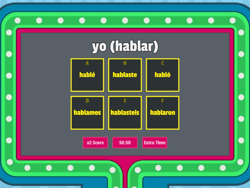 1) yo (hablar) a) hablé b) hablaste c) habló d) hablamos e) hablasteis f) hablaron 2) él (cantar) a) canté b) cantaste c) cantó d) cantamos e) cantasteis f) cantaron 3) ellos (caminar) a) caminé b) caminaste c) caminó d) caminamos e) caminasteis f) caminaron 4) tú (comer) a) comí b) comiste c) comió d) comimos e) comisteis f) comieron 5) vosotros (beber) a) bebí b) bebiste c) bebió d) bebimos e) bebisteis f) bebieron 6) nosotros (correr) a) corrí b) corriste c) corrió d) corrimos e) corristeis f) corrieron 7) él (vivir) a) viví b) vivistes c) vivió d) vivimos e) vivisteis f) vivieron 8) yo (subir) a) subí b) subistes c) subió d) subimos e) subisteis f) subieron 9) ustedes (escribir) a) escribí b) escribistes c) escribió d) escribimos e) escribisteis f) escribieron 10) yo (recibir) a) recibí b) recibistes c) recibió d) recibimos e) recibisteis f) recibieron