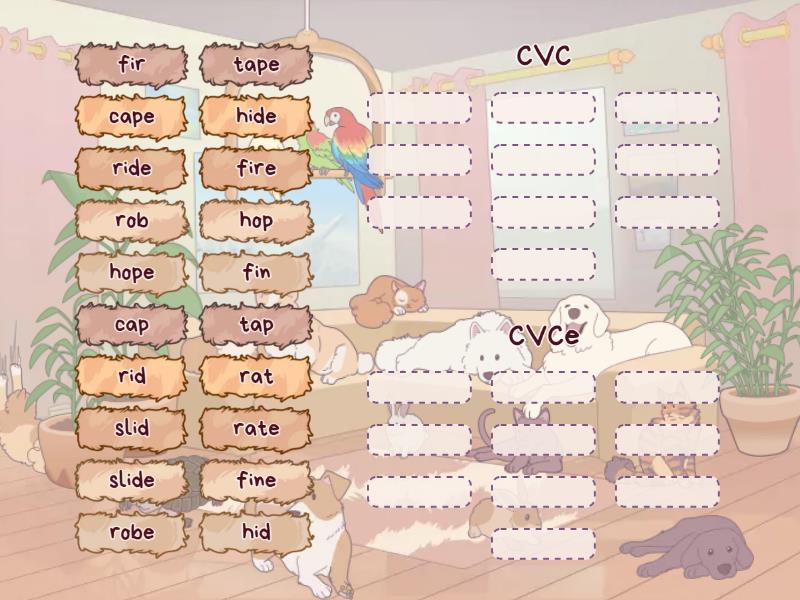 CVC: rob, slid, cap, fin, tap, hid, hop, rid, fir, rat, CVCe: rate, fire, ride, hope, tape, fine, cape, slide, robe, hide,