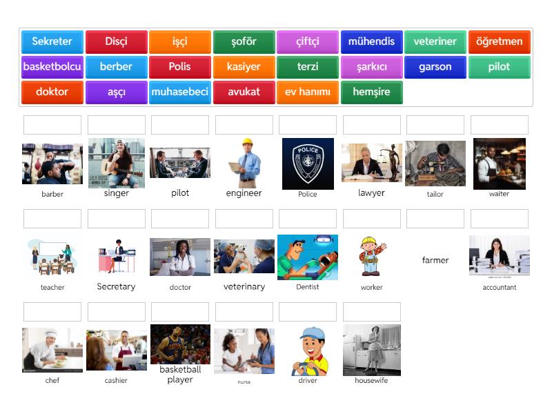 mühendis - engineer, veteriner - veterinary, çiftçi - farmer, avukat - lawyer, pilot - pilot, öğretmen - teacher, doktor - doctor, şarkıcı - singer, şoför - driver, işçi - worker, basketbolcu - basketball player, hemşire - nurse, berber - barber, kasiyer - cashier, ev hanımı - housewife, aşçı - chef, terzi - tailor, muhasebeci - accountant, garson - waiter, Polis - Police, Disçi - Dentist, Sekreter - Secretary,