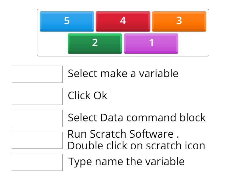 1 - Run Scratch Software . Double click on scratch icon, 2 - Select make a variable, 3 - Type name the variable, 4 - Select Data command block, 5 - Click Ok,