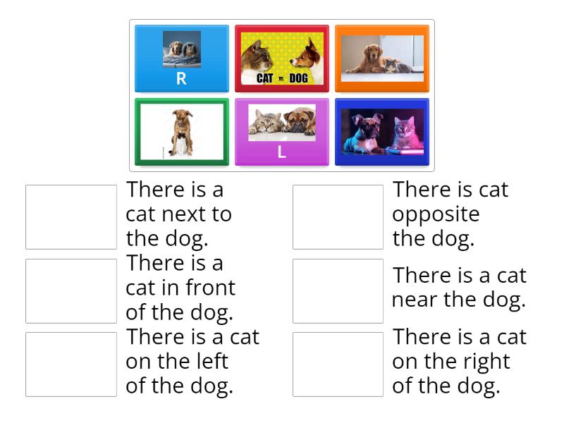 There is a cat near the dog., There is a cat next to the dog., There is cat opposite the dog., There is a cat in front of the dog., R - There is a cat on the right of the dog., L - There is a cat on the left of the dog.,