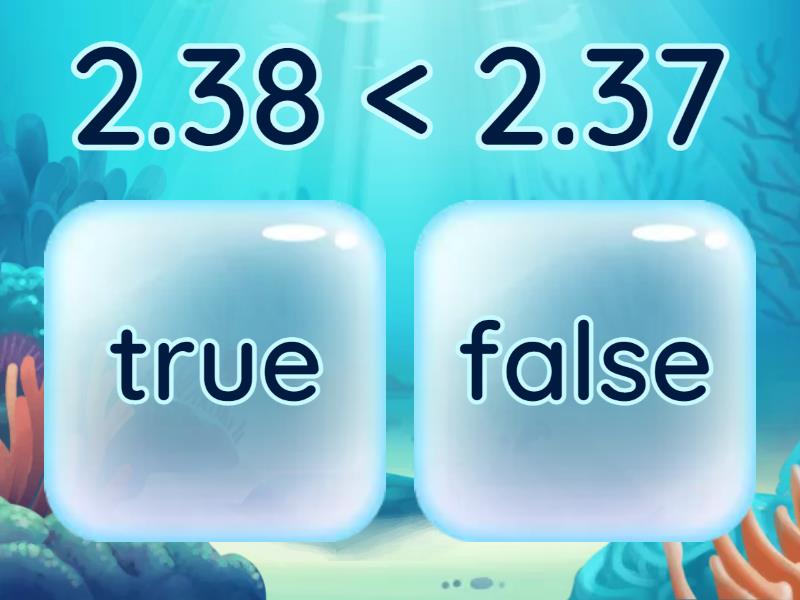 1) 2.38 < 2.37 a) true b) false 2) 4.83 > 4.38 a) true b) false 3) 5.67 > 5.8 a) true b) false 4) 6.29 > 6.1 a) true b) false 5) 7.88 > 7.8 a) true b) false 6) 4.66 < 4.68 a) true b) false 7) 4.5 > 4.73 a) true b) false 8) 6.71 = 6.7 a) true b) false 9) 4.38 > 4.38 a) true b) false 10) 3.2 > 3.12 a) true b) false
