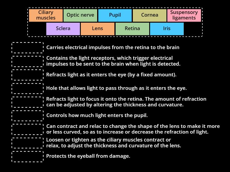 Retina - Contains the light receptors, which trigger electrical impulses to be sent to the brain when light is detected., Optic nerve - Carries electrical impulses from the retina to the brain, Sclera - Protects the eyeball from damage., Cornea - Refracts light as it enters the eye (by a fixed amount)., Iris - Controls how much light enters the pupil., Pupil - Hole that allows light to pass through as it enters the eye., Lens - Refracts light to focus it onto the retina. The amount of refraction can be adjusted by altering the thickness and curvature., Ciliary muscles - Can contract and relac to change the shape of the lens to make it more or less curved, so as to increase or decrease the refraction of light., Suspensory ligaments - Loosen or tighten as the ciliary muscles contract or relax, to adjust the thickness and curvature of the lens.,