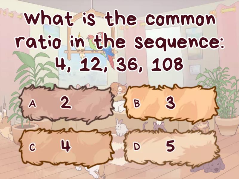 1) what is the common ratio in the sequence: 4, 12, 36, 108 a) 2 b) 3 c) 4 d) 5 2) The first term of a geometric sequence is 5, and the common ratio is 2. What is the 3rd term? a) 10 b) 15 c) 20 d) 40 3) which of the following is a geometric sequence? a) 2,4,6,8 b) 1,3,9,27 c) 5,10,15,20 d) 7,14,21,28 4) find the 4th term of the sequence where a¹ = 3 and r = 5 a) 15 b) 75 c) 375 d) 18 5) if the 1st term of a geometric sequence is 8 and the common ratio is ½, what is the 6th term? a) 0.5 b) 1 c) 2 d) 4 6) what is the sum of the first 3 terms of the geometric sequence: 2,6,18? a) 24 b) 26 c) 30 d) 32 7) in a geometric sequence, the 3rd term is 27, and the common ratio is 3 what is the 1st term? a) 3 b) 9 c) 1 d) 27 8) which formula represents the n-th term of a geometric sequence? a) a/n = a/1 + ( n- 1) d b) a/n = a/1 • r (n - 1) c) a/n = d • n d) a/n = a/1 + d • n 9) the 1st term of a geometric sequence is 10, and the common ratio is 0.5 what is the 5th term? a) 1.25 b) 2.5 c) 5 d) 10 10) what is the 2nd term of the geometric sequence where a/1 = 7 and r = 3? a) 21 b) 14 c) 28 d) 10 11) in a geometric sequence, if the 2nd term is 4 and the common ratio is 2, what is the 1st term? a) 2 b) 3 c) 1 d) 8 12) what is the 6th term of the geometric sequence: 1,2,4,8 a) 16 b) 32 c) 64 d) 128 13) if the 4th term of a geometric sequence is 64 and the common ratio is 2, what is the 1st term? a) 4 b) 8 c) 16 d) 32 14) Find the common ratio in the sequence: 1,5,25,125, a) 2 b) 3 c) 4 d) 5 15) the sum of the first 4 terms of a geometric sequence is 30. If the first term is 2, what is the common ratio a) 2 b) 3 c) 4 d) 5