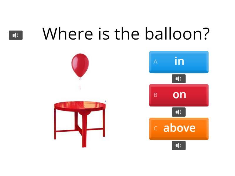 1) Where is the balloon? a) in b) on c) above 2) Where is the cat? a) under b) next to c) between 3) Where is the triangle? a) below b) next c) middle 4) Where is the square? a) in between b) above c) below 5) Where are the candles? a) in b) above c) on 6) Where are the shoes? a) on b) inside c) over