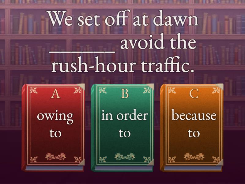 1) We set off at dawn ______ avoid the rush-hour traffic. a) owing to b) in order to c) because to 2) Sales figures have fallen drastically ______ the economic downturn. a) due to b) because c) so as to 3) The decorators covered the furniture with sheets ______ splash it with paint. a) so as to b) in order to c) in order not to 4) After his accident, my brother had to sell his car ______ he couldn't afford the insurance. a) since b) due to c) so as not to 5) The company is trying to reduce costs, ______ employees who leave are not being replaced. a) seeing as b) in order to c) consequently 6) I left a message ______ the head of human resources wasn't at her desk. a) therefore b) because c) so as to 7) The project had to be abandoned ______ a lack of funding. a) consequently b) owing to c) so that they could 8) She arrived early ______ get a good seat. a) to b) because of c) as a result 9) We haven't received your payment. ______, you are being sent a reminder. a) because of b) in case c) consequently 10) She wrote down the appointment ______ she wouldn't forget it. a) so that b) as to c) in order not to 11) The motorway is being resurfaced, ______ it will be closed until the end of the year. a) because of b) as a result c) so as to 12) You'd better take your keys ______ I decide to go out. a) so as not to b) therefore c) in case 13) He was unable to attend the conference ______ he was ill. a) owing to the fact that b) so as to c) consequently 14) I doubt that Ben will be offered the job, ______ he doesn't have qualifications. a) so that b) therefore c) seeing as 15) I won't switch my phone off ______ you need to call me. a) owing to b) in case c) so