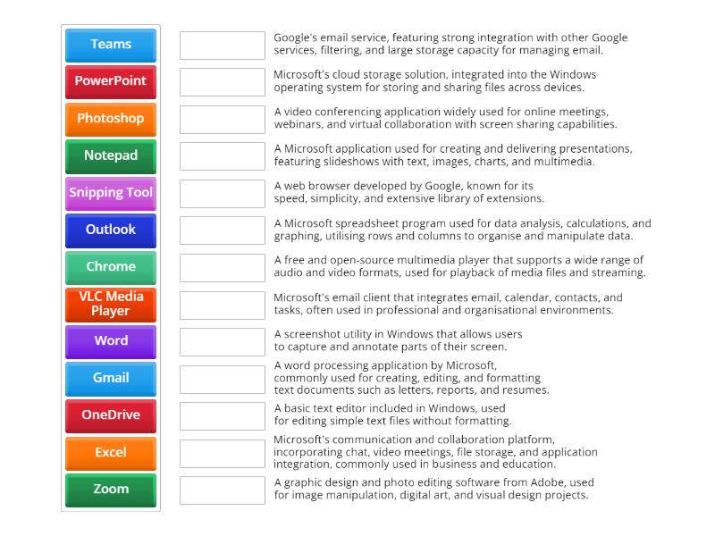 Chrome - A web browser developed by Google, known for its speed, simplicity, and extensive library of extensions., PowerPoint - A Microsoft application used for creating and delivering presentations, featuring slideshows with text, images, charts, and multimedia., Word - A word processing application by Microsoft, commonly used for creating, editing, and formatting text documents such as letters, reports, and resumes., Excel - A Microsoft spreadsheet program used for data analysis, calculations, and graphing, utilising rows and columns to organise and manipulate data., Outlook - Microsoft’s email client that integrates email, calendar, contacts, and tasks, often used in professional and organisational environments., Snipping Tool - A screenshot utility in Windows that allows users to capture and annotate parts of their screen., OneDrive - Microsoft’s cloud storage solution, integrated into the Windows operating system for storing and sharing files across devices., Photoshop - A graphic design and photo editing software from Adobe, used for image manipulation, digital art, and visual design projects., Zoom - A video conferencing application widely used for online meetings, webinars, and virtual collaboration with screen sharing capabilities., Teams - Microsoft’s communication and collaboration platform, incorporating chat, video meetings, file storage, and application integration, commonly used in business and education., Gmail - Google’s email service, featuring strong integration with other Google services, filtering, and large storage capacity for managing email., Notepad - A basic text editor included in Windows, used for editing simple text files without formatting., VLC Media Player - A free and open-source multimedia player that supports a wide range of audio and video formats, used for playback of media files and streaming.,