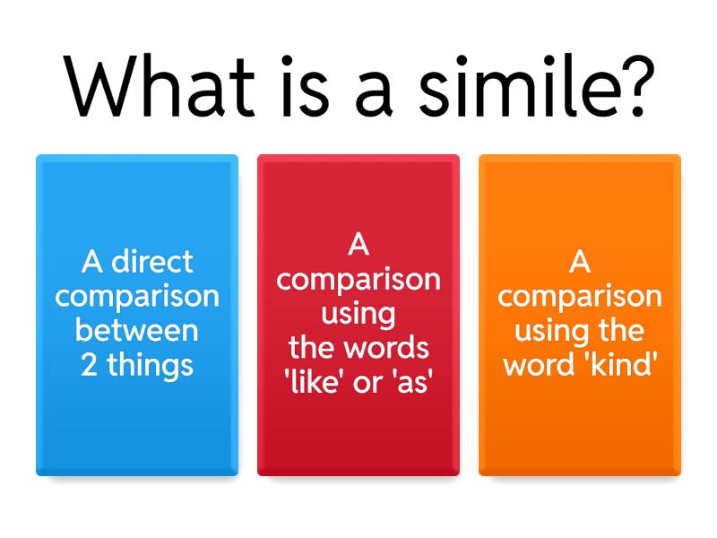 1) What is a simile? a) A direct comparison between 2 things b) A comparison using the words 'like' or 'as' c) A comparison using the word 'kind' 2) What is a metaphor? a) A comparison using the word 'kind' b) A comparison using the words 'like' or 'as' c) A direct comparison between two things 3) It is raining cats and dogs is an example of? a) A metaphor b) A simile c) A smile d) A bad joke 4) 'It is raining cats an dogs' suggests that... a) There are animals falling from the sky b) The rain is loud c) The weather is fine d) Cats and dogs are crying e) It is raining so hard it feels like animals are hitting you 5) If we say the girl is like a mouse- what are we saying is similar? a) her size b) how furry she is c) how loud she is d) how quiet she is e) how quickly she scuttles 6) Which of the following is a simile? a) The monstrous baby b) The green forest c) The boy is as quick as a jackal d) The boy is a angel 7) Which of the following is a metaphor? a) The daughter is a devil b) The sad mother c) The mum is as skinny as a bean pole d) The daughter is scared 8) Which of the following is the correct spelling? a) similie b) simile c) smile d) smilie 9) which is the correct spelling for the following ? a) metapor b) metaphore c) metipor d) metaphor e) metipore 10) Which of the following is not a simile or a metaphor? a) He is a lion b) She is like a eagle c) It is as heavy as a brick d) He is tall e) She is eagle eyed f) She is as white as a ghost