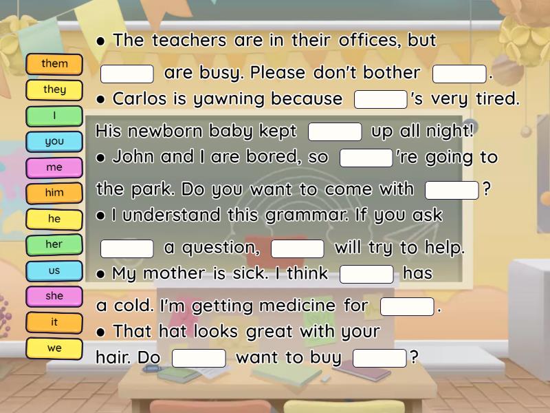 ● The teachers are in their offices, but ____ are busy. Please don't bother ____. ● Carlos is yawning because ____'s very tired. His newborn baby kept ____ up all night! ● John and I are bored, so ____'re going to the park. Do you want to come with ____? ● I understand this grammar. If you ask ____ a question, ____ will try to help. ● My mother is sick. I think ____ has a cold. I'm getting medicine for ____. ● That hat looks great with your hair. Do ____ want to buy ____?