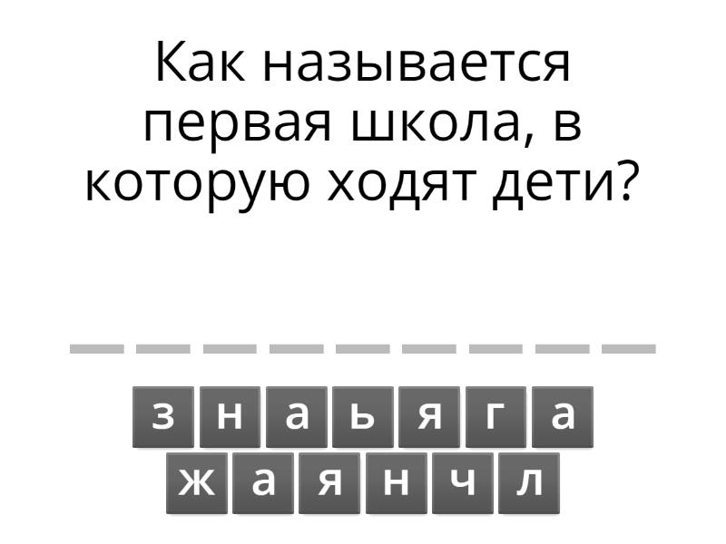 игровой - Какой главный метод обучения в начальных классах?, четыре - Сколько лет продолжаются начальные классы? , один преподаватель - Какое главное отличие начальных классов от средних и старших?, начальная - Как называется первая школа, в которую ходят дети?, класс - Как называется место, где проводятся уроки в начальной школе?,