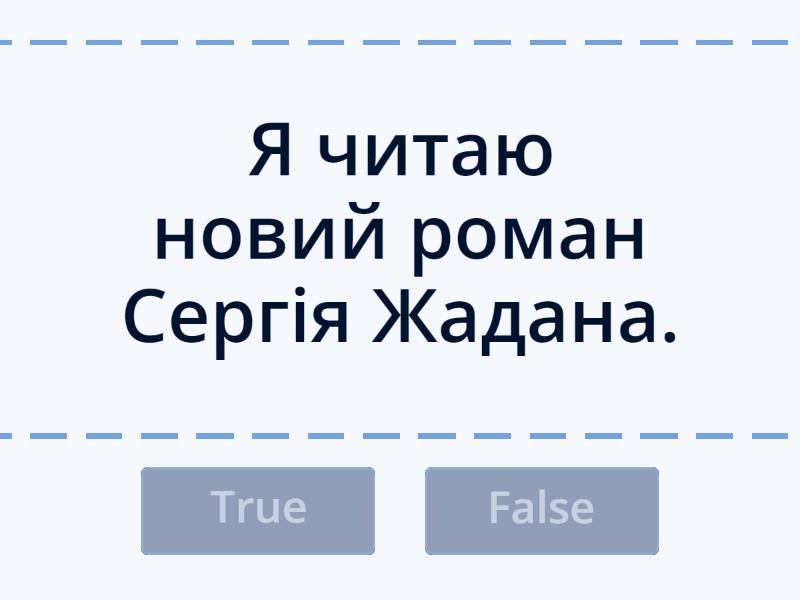 True: Я читаю новий роман Сергія Жадана., Владислав Бухов так швидко плаває!, Є-МОВА навчає української онлайн., Вони грають у теніс на вихідних., "Дахабраха" співають українські пісні?, Чи ми бігаємо сьогодні ввечері?, На кого вони чекають?, Ви снідаєте щоранку?, Нарешті я все розумію!, Ти вмієш плавати?, Ми замовляємо піцу на вечерю?, Ми зазвичай вечеряємо вдома., False: Що ти думає про квадробіку?, Чи Оленка вивчаю корейську? Вона вже добре говорить!, Хто грати головну роль у фільмі "Барбі"?, Співак Shumei гарно грати на фортепіано., Які подкасти ти зараз слухаю?, Ти нічого не знаєте, Джон Сноу!, Що ви шукають? Я можу допомоготи?, Я часто обідає у "Львівських круасанах"!, Що ви чують?, З ким вони розмовляти?, Зранку вона гуляти з собакою.,