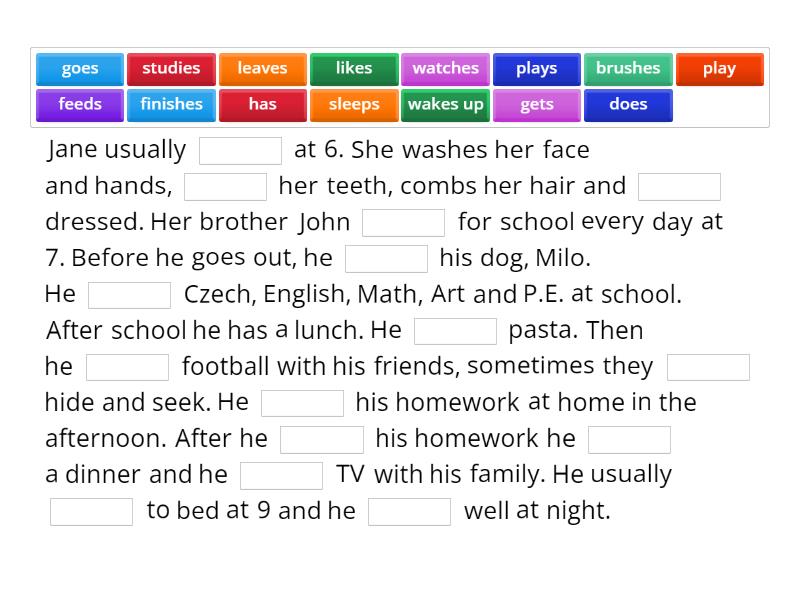 Jane usually ____ at 6. She washes her face and hands, ____ her teeth, combs her hair and ____ dressed. Her brother John ____ for school every day at 7. Before he goes out, he ____ his dog, Milo. He ____ Czech, English, Math, Art and P.E. at school. After school he has a lunch. He ____ pasta. Then he ____ football with his friends, sometimes they ____ hide and seek. He ____ his homework at home in the afternoon. After he ____ his homework he ____ a dinner and he ____ TV with his family. He usually ____ to bed at 9 and he ____ well at night.