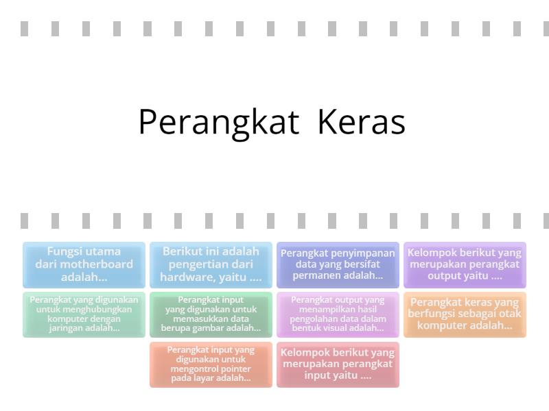 Berikut ini adalah pengertian dari hardware, yaitu .... - Perangkat Keras, Kelompok berikut yang merupakan perangkat input yaitu ....  - Keyboard, Mouse, Mic, Perangkat keras yang berfungsi sebagai otak komputer adalah... - CPU, Perangkat input yang digunakan untuk memasukkan data berupa gambar adalah... - Scanner, Perangkat output yang menampilkan hasil pengolahan data dalam bentuk visual adalah... - Monitor, Perangkat penyimpanan data yang bersifat permanen adalah... - Hard disk, Perangkat yang digunakan untuk menghubungkan komputer dengan jaringan adalah... - Network card, Perangkat input yang digunakan untuk mengontrol pointer pada layar adalah... - Mouse, Kelompok berikut yang merupakan perangkat output yaitu .... - Printer, Speaker, Monitor, Fungsi utama dari motherboard adalah... - Menghubungkan komponen-komponen komputer,