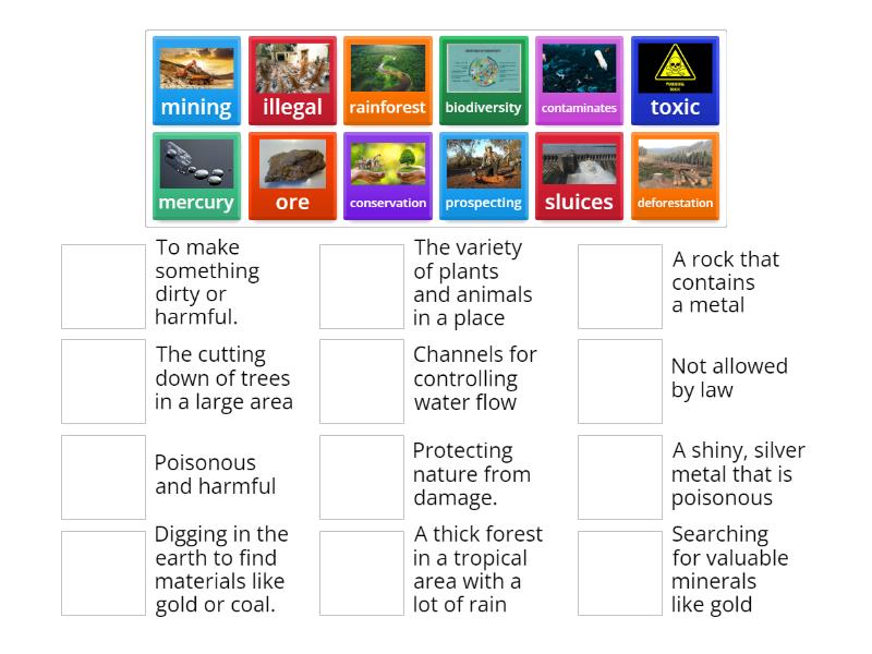 biodiversity - The variety of plants and animals in a place, conservation - Protecting nature from damage., contaminates - To make something dirty or harmful., deforestation - The cutting down of trees in a large area, illegal - Not allowed by law, mercury - A shiny, silver metal that is poisonous, mining - Digging in the earth to find materials like gold or coal., ore - A rock that contains a metal, prospecting - Searching for valuable minerals like gold, rainforest - A thick forest in a tropical area with a lot of rain, sluices - Channels for controlling water flow, toxic - Poisonous and harmful,